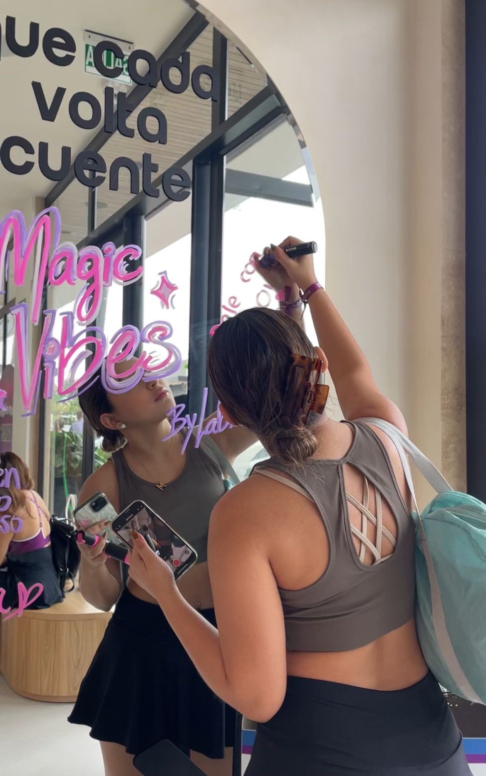 Uno de los rincones favoritos fue nuestro espejo interactivo, donde cada participante podía escribir una frase sobre lo que significa para ellos soltar el estrés.